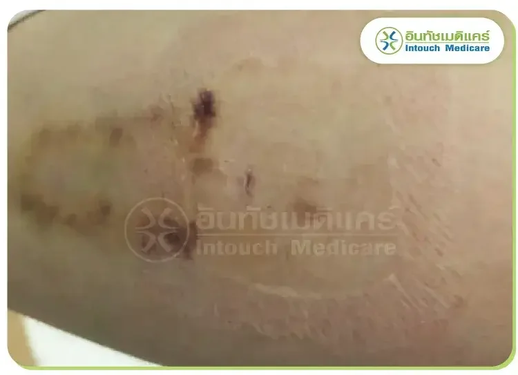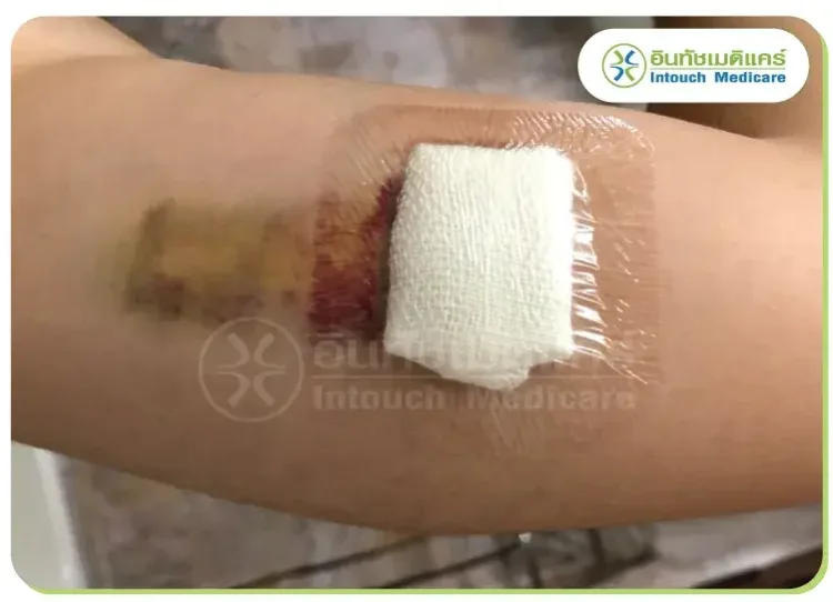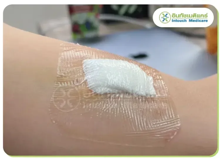 ဒဏ်ရာကို သန္ဓေတားနည်းဖြင့် ဖုံးထားပြီးနောက် ဒဏ်ရာကို ရေနှင့်ထိတွေ့ခြင်းမှ တားဆီးရန် ကပ်ထားသော အင်္ဂတေကိုင်ကာ ဖုံးအုပ်ထားသည်။